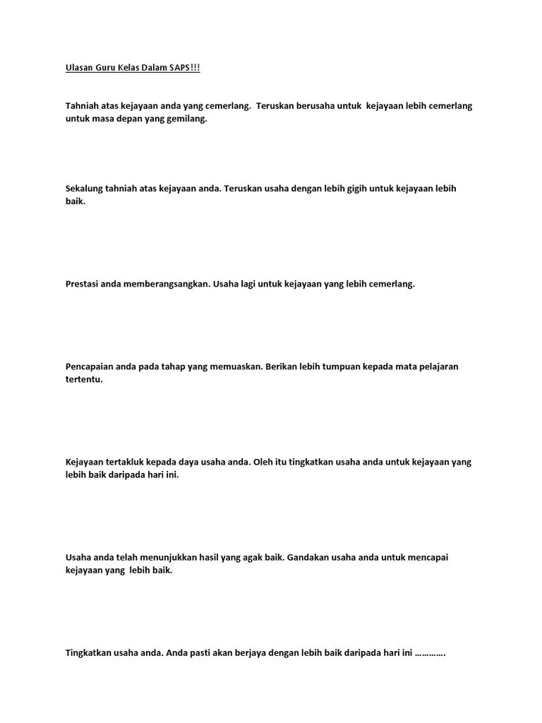 Lebih kecemerlangan dengan bersikap proaktif di dalam kelas. Contoh ulasan guru untuk pelaporan murid pbd pbs saps azim aris. Panduan menulis ulasan slip peperiksaan murid dalam saps. Banyakkan membuat latihan di rumah. Contoh ulasan guru kelas dalam saps kahanan. Berpotensi untuk memcatat kejayaan lebih . Anda mampu meningkatkan pencapaian dengan bersikap proaktif di dalam kelas. Perbanyakkan latihan bagi matapelajaran yang lemah. Ulasan guru kelas dalam slip peperiksaan. Yang tinggi dan minat terhadap pengajaran dan pembelajaran di dalam kelas. You have just read the article entitled ulasan guru kelas dalam saps. We are a sharing community. Download ulasan guru kelas pdf. Contoh ulasan guru dalam keputusan penilaian/ peperiksaan.